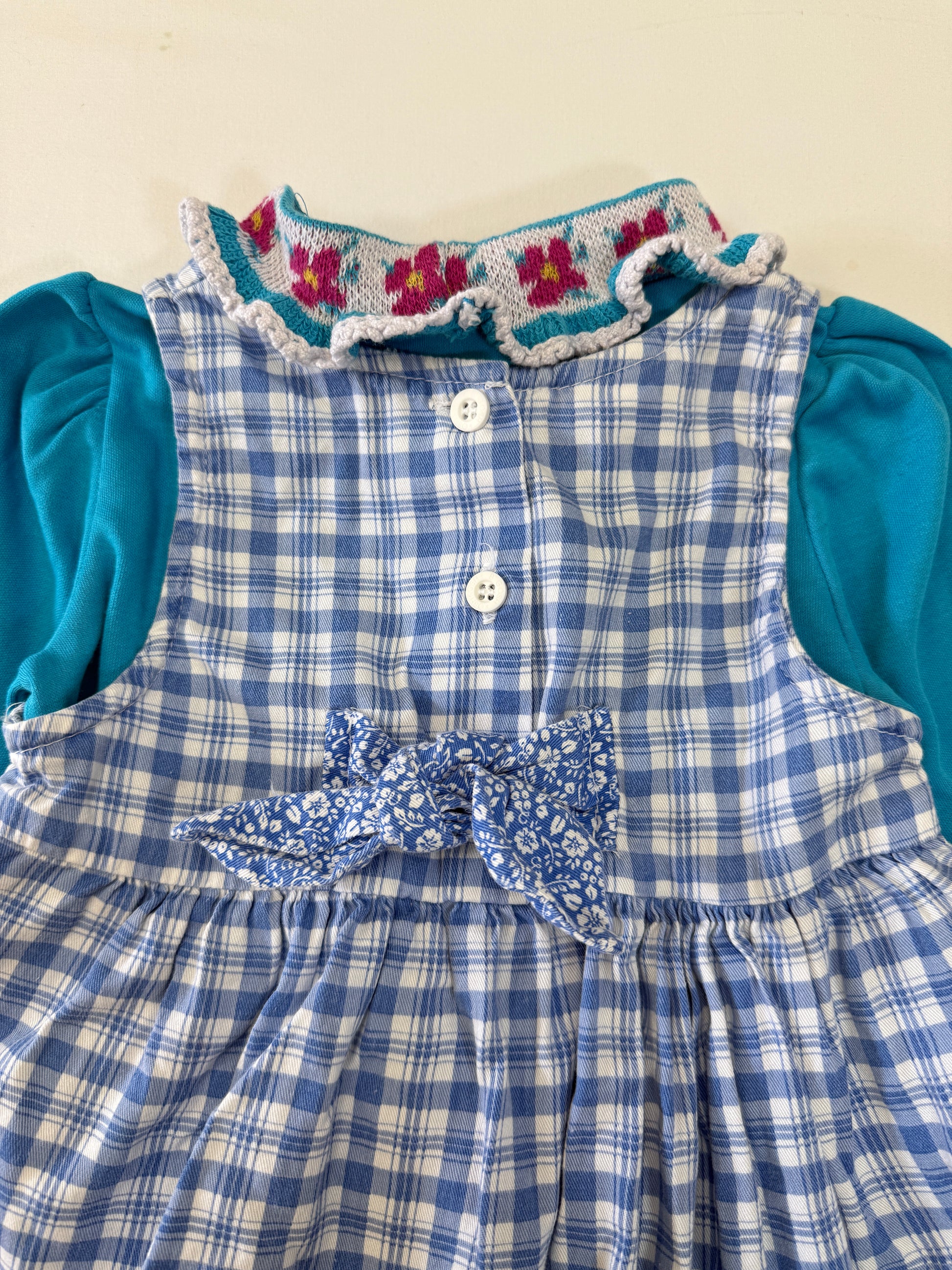 90s Y2K Kids Toddler Infant Vintage Oshkosh Bgosh Blue Check Dress and Puff Sleeve Floral Print Longsleeve Top 2pc Set / 12m 18m 24m / Made in USA dress set