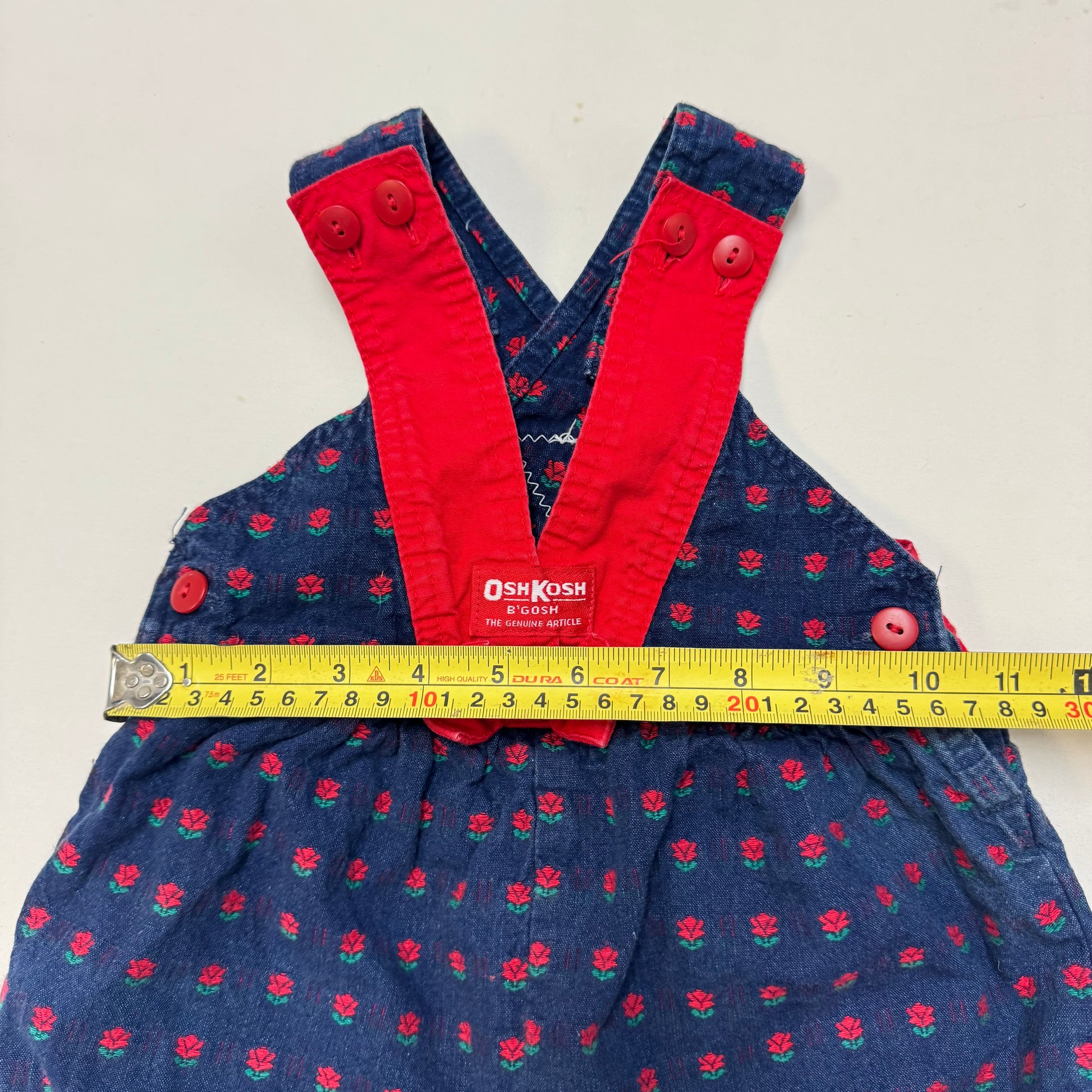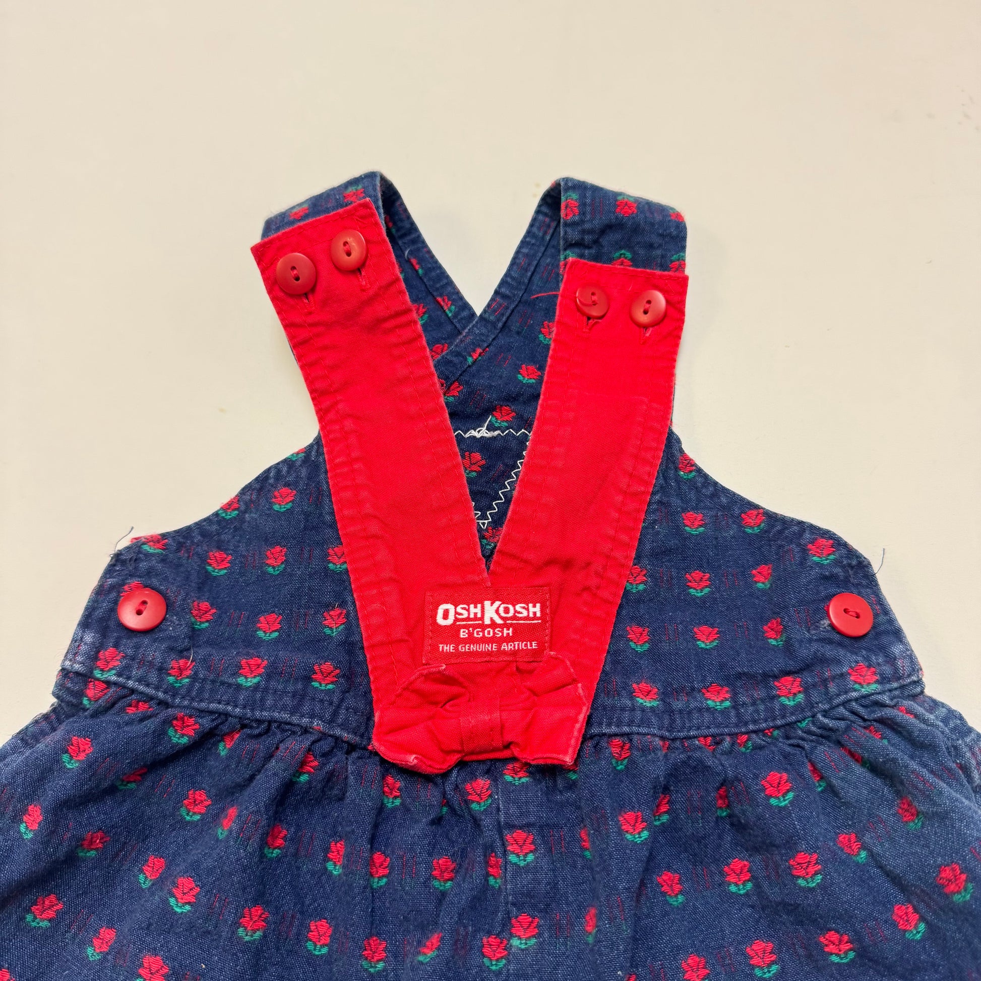 90s Kids Toddler Infant Vintage Baby B’Gosh Oshkosh Criss Cross Dark Denim Red Flower Print AOP Romper //2T / Made in USA