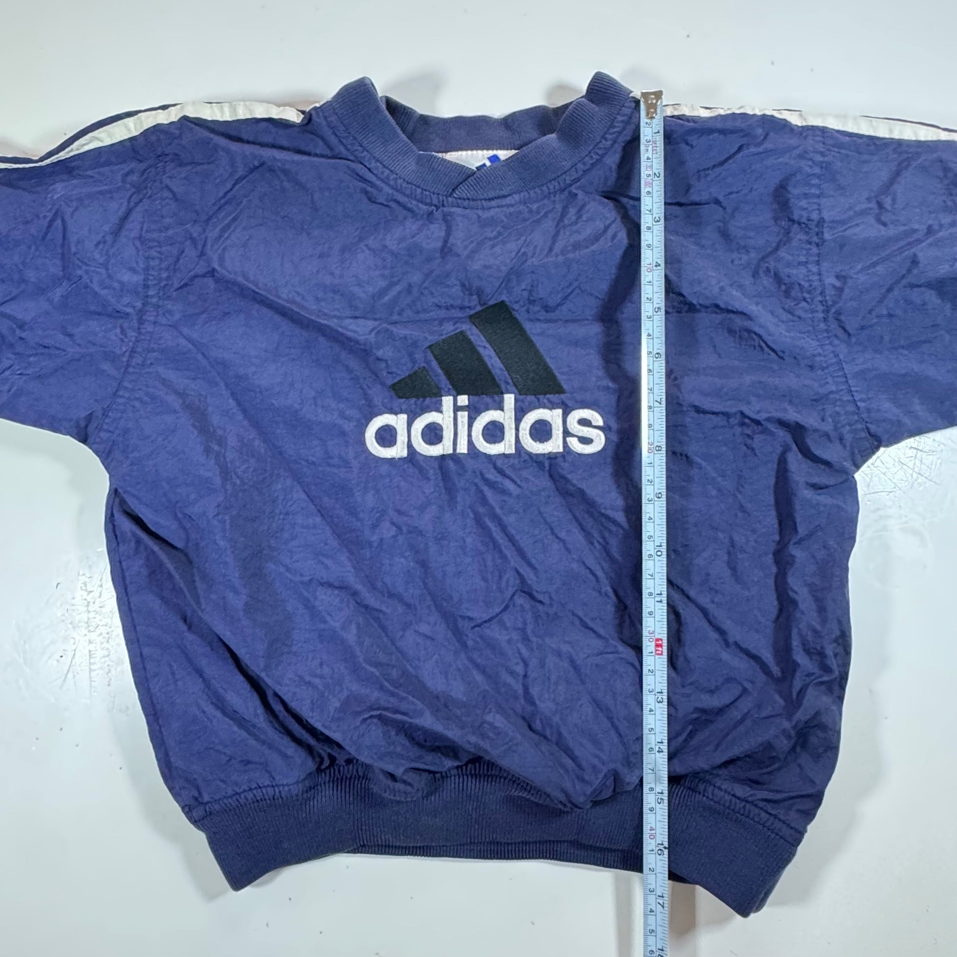 90s Vintage Adidas Kids Toddler Blue/Navy Lined Pullover Sleeves Striped Windbreaker Sweatshirt Jacket Big Logo L 6Y